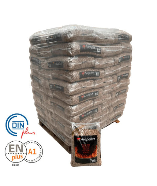 Pellets de madera Arapellet, una opción eficiente, ecológica y económica para mantener tu hogar cálido durante todo el año. Este producto se presenta en un formato palet que incluye 77 sacos, cada uno con 15 kg de pellets elaborados a partir de madera de pino de alta calidad.